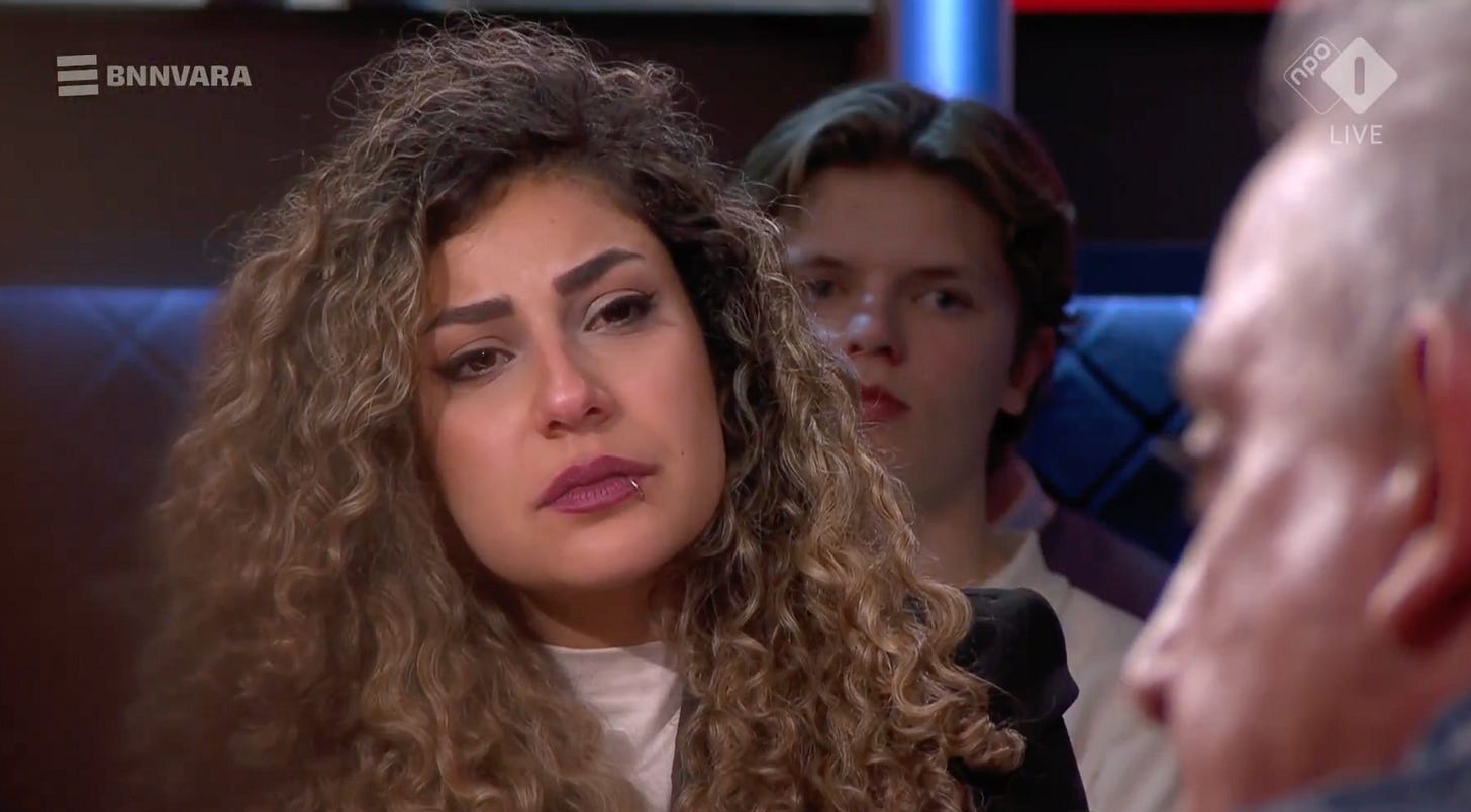 I have seldom seen such a piece of television that not only hit emotionally, but that also made it visible as to how deep the gap is between the predominant mainstream thinking about Iran and the gruesome realities that Iranians have endured over the years. Dutch ‘X’ is on fire today of what happened in the show and I share the end of it in a short video here. It is in Dutch, but you don’t need to understand the words, just look at these two incredible human beings who share their deepest feelings and traumas live on TV: