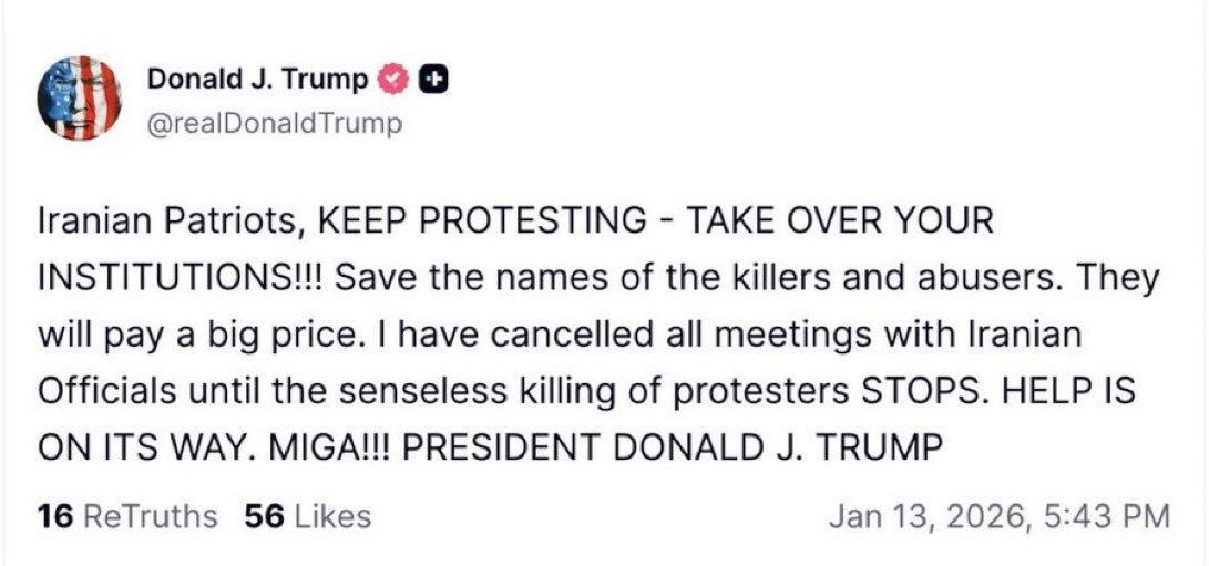 All of this to say is that: (a) calls for action do not always translate into effective support as there are significant political and military risks; and (b) even with US intervention there may still be a lot of blood on the streets of Iran before it can see a return to freedom and peace. Trump could also exploit the fissures Iran’s leadership, take out Khamenei and strike a deal with the generals that step in which could involve some financial incentives. Who knows. I sincerely hope Trump will intervene and help with whatever means to end it all, but please be realistic with expectations.